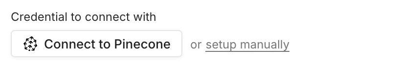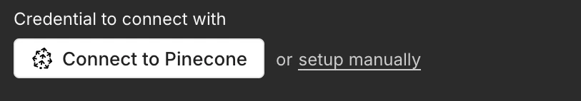 - Use the Connect to Pinecone button in the node to connect to a new or existing Pinecone account: