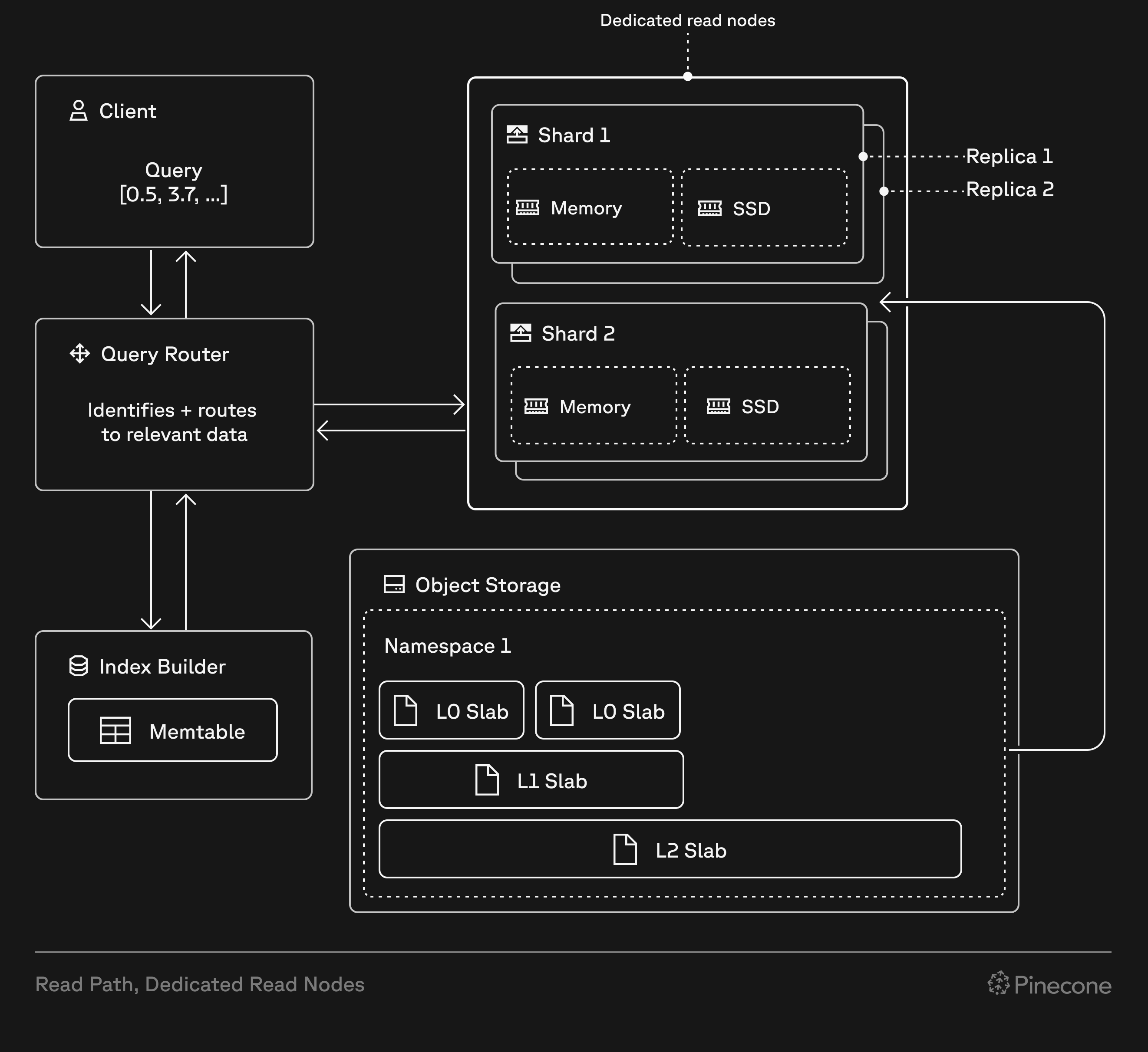 Pinecone indexes built on dedicated read nodes use provisioned read hardware to provide predictable, consistent performance at sustained, high query volumes. They’re designed for large-scale vector workloads such as semantic search, recommendation engines, and mission-critical services. Dedicated read nodes differ from on-demand indexes in how they handle read operations. While on-demand indexes use shared, multi-tenant capacity for reads, dedicated read nodes provision exclusive hardware for reads—memory, local SSDs, and compute. Both index types use Pinecone’s serverless infrastructure for writes and storage. When you create a dedicated read nodes index, Pinecone provisions resources based on your choice of node type, number of shards, and number of replicas. These resources include local SSDs and memory that cache all your index data, and provide dedicated query executors to handle read operations (query, fetch, list). This architecture eliminates cold starts and ensures consistent low-latency performance, even under heavy load. Dedicated read nodes support dense, sparse, or hybrid indexes, giving you flexibility in your search and retrieval strategy. Because storage (shards) and compute (replicas) scale independently, you can optimize for your specific workload characteristics.