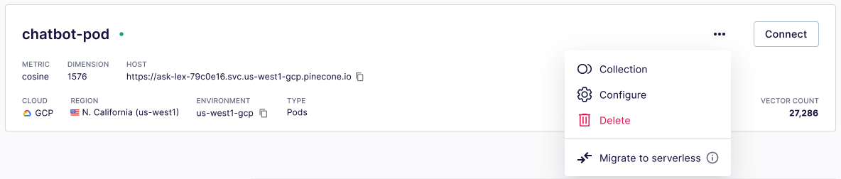 In the Pinecone console, go to your pod-based index and click the ellipsis (…) menu > Migrate to serverless.