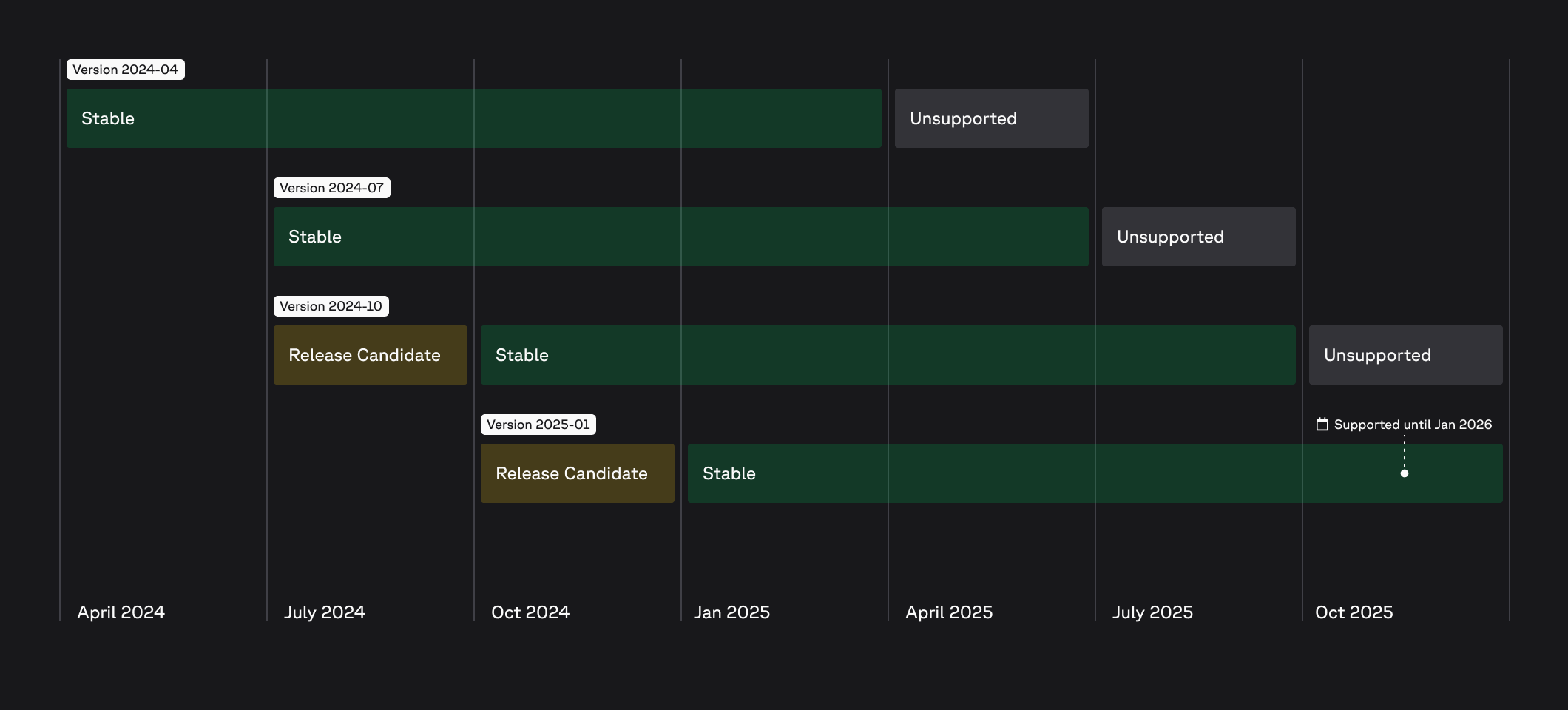 - Release candidate: The release candidate gives you insight into the upcoming changes in the next stable version. It is available for approximately 3 months before the release of the stable version and can include new features, improvements, and breaking changes.